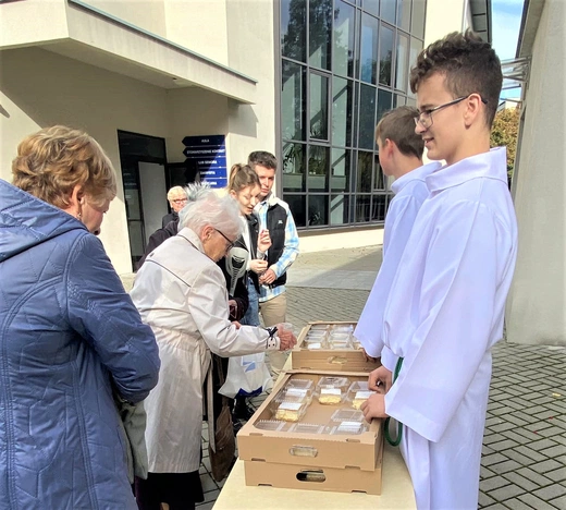 Młodzież w parafii pw. bł. P.J. Frassatiego rozprowadza papieskie kremówki, zbierając pieniądze na stypendia.